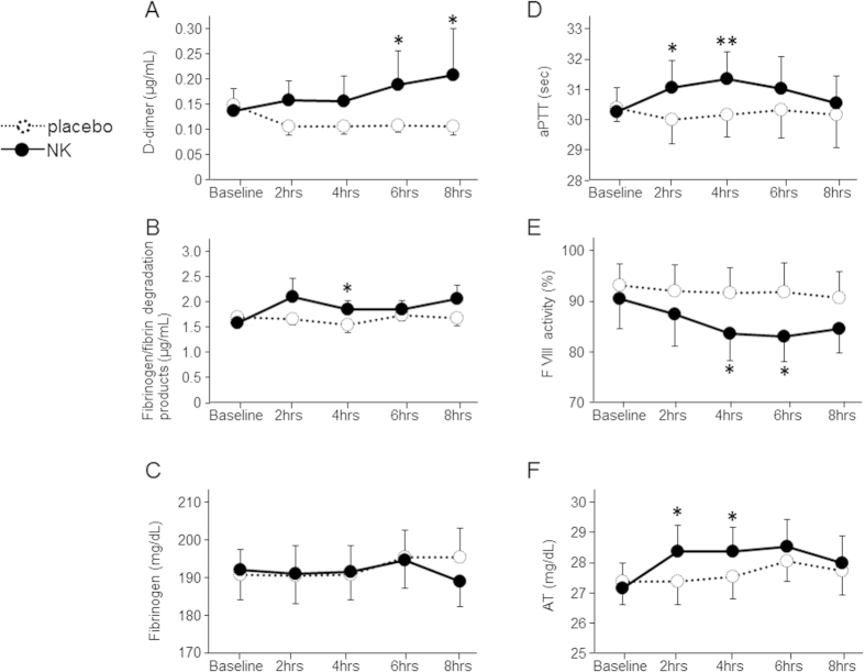 Hoạt động của F VIII giảm ở 4 và 6 giờ sau khi uống Nattokinase (trung bình −7,4 ± 1,9% và −7,6 ± 1,6% so với dữ liệu ban đầu, p <0,05 đối với giả dược, tương ứng, Hình 2E).